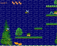 You are a squirrel that needs to collect food and safely return the food to your nest. There are many predators looking to get you. Stay away from them! |